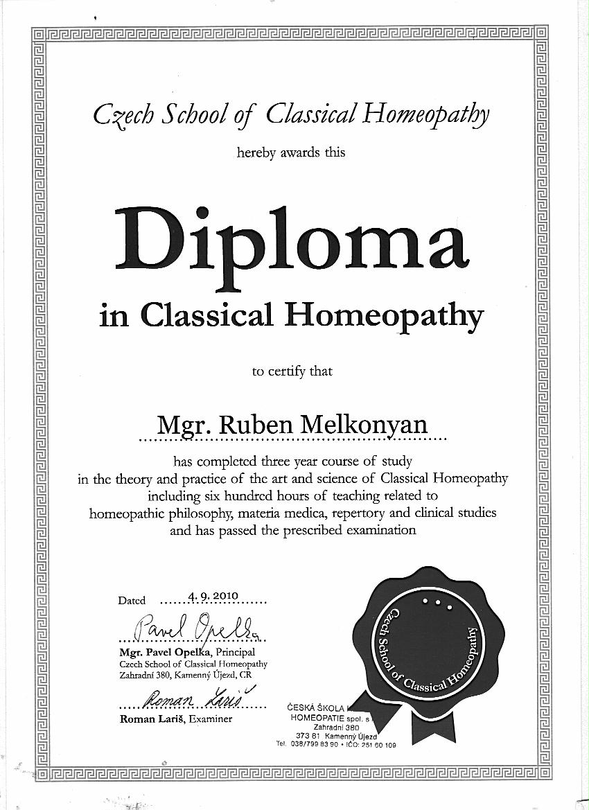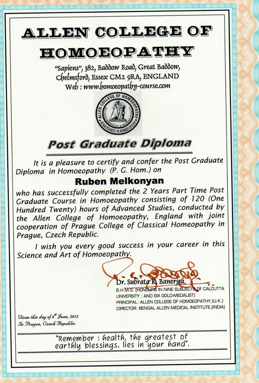 Jmenuji se Ruben Melkonyan. Podle vzdělání jsem magistr farmacie, a mám za sebou také homeopatickou školu a řadu kurzů,tady uvádim ty nejvetší: jeden rok studia na Homeopatické akademii ( 2004-2005)v Praze, u pana magistra Čehóvského. Ukončené tříleté studium (2007-2010) na České škole klasické homeopatii v Praze, pod vedením pana magistra Opelky( tady dole je vidět diplom).V květnu 2012 jsen ukončil Dvouletý postgradualní kurz Allen College of Homeopathy , se sídlem ve Velké Británii, jejímž ředitelem je Dr. S. K. Banerjea,diplom je vidět dole,vyuka proběhla ve spolupráci sPrague College of Classical Homeopathy, pod vedením pana Petra Zachariaše.